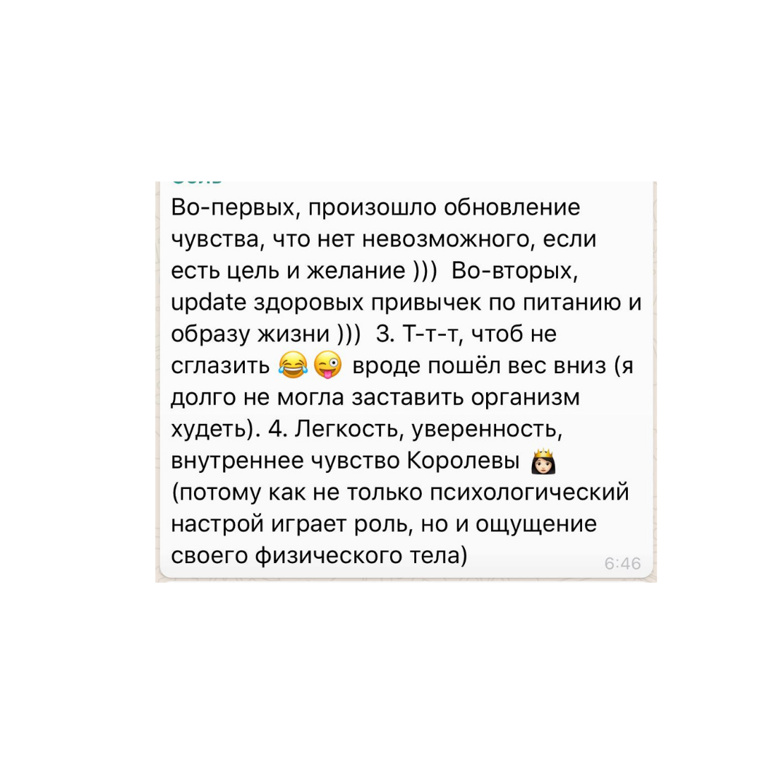В результате прохождения моей программы очищения вы почувствуете приток энергии, кислорода и питательных веществ к клеткам, нормализацию обмена веществ и оздоровление.