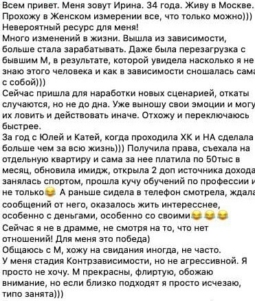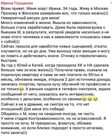 В работе использую элементы гештальттерапии, психоанализа, эриксоновского гипноза, символдрамы, энергетические и телесеные практики и т.д. Я провожу индивидуальные консультации и веду тренинги для женщин уже почти 20 лет. На сегодняшний день это около 12 000 человек.