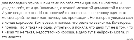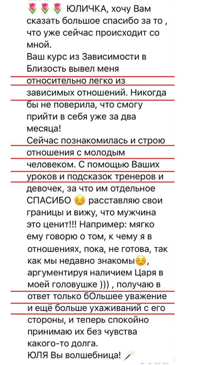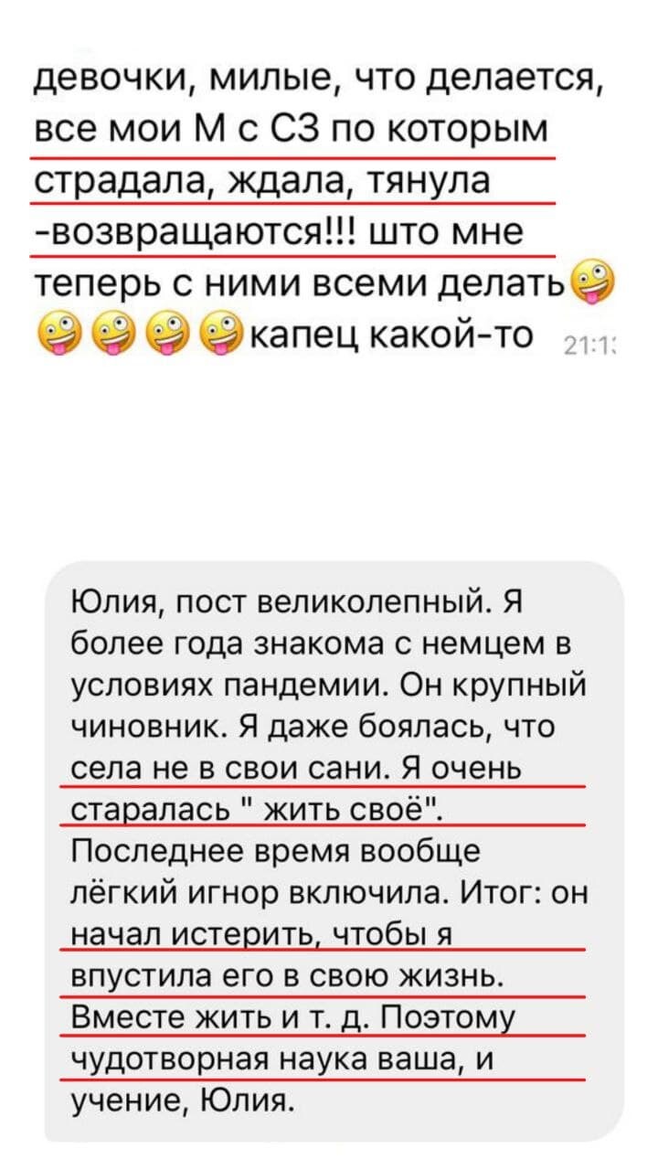 Своим профессиональным и женским опытом я делюсь в своем инстаграм блоге @jsviyash. Но каждая ситуация очень индивидуальна. И для того чтобы выйти из кризиса в отношениях, разобраться в себе, снять болевую точку нужна серия индивидуальных консультаций с психологом, а иногда даже с психотерапевтом.